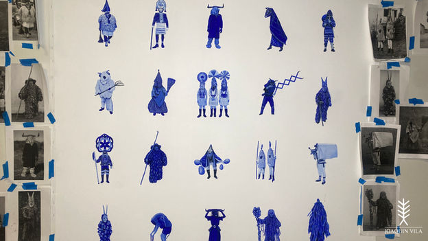 The painting is presented as a documentary inventory with a selection of 20 Masquerades from Spain and Portugal, from Guadalajara, Navarra, León, Galicia to Bragança among others, showing some of the most representative characters of these. Among them we can find vegetable, animal, monstrous, or more humanized beings, but all of them come out of a common magical universe that sinks its roots in the night of the times.